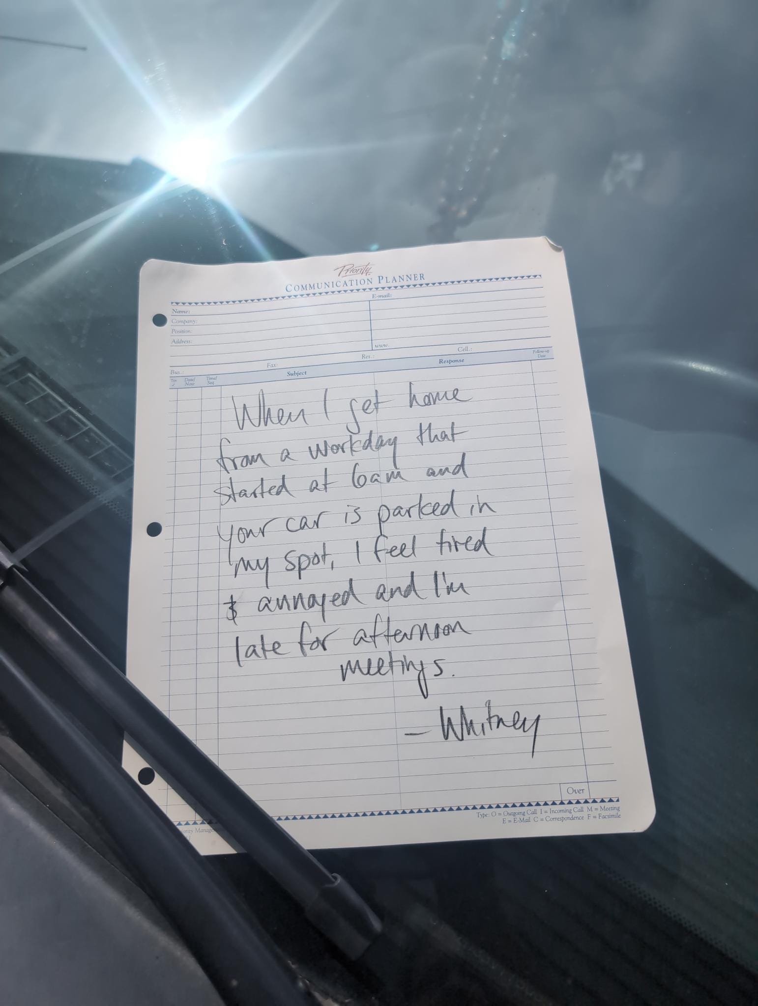 I appreciate the way this skill offers the best chance of avoiding blame and leaving a relationship intact – even with strangers. I left this message on the car of someone I didn't know and felt good about practicing the skill.